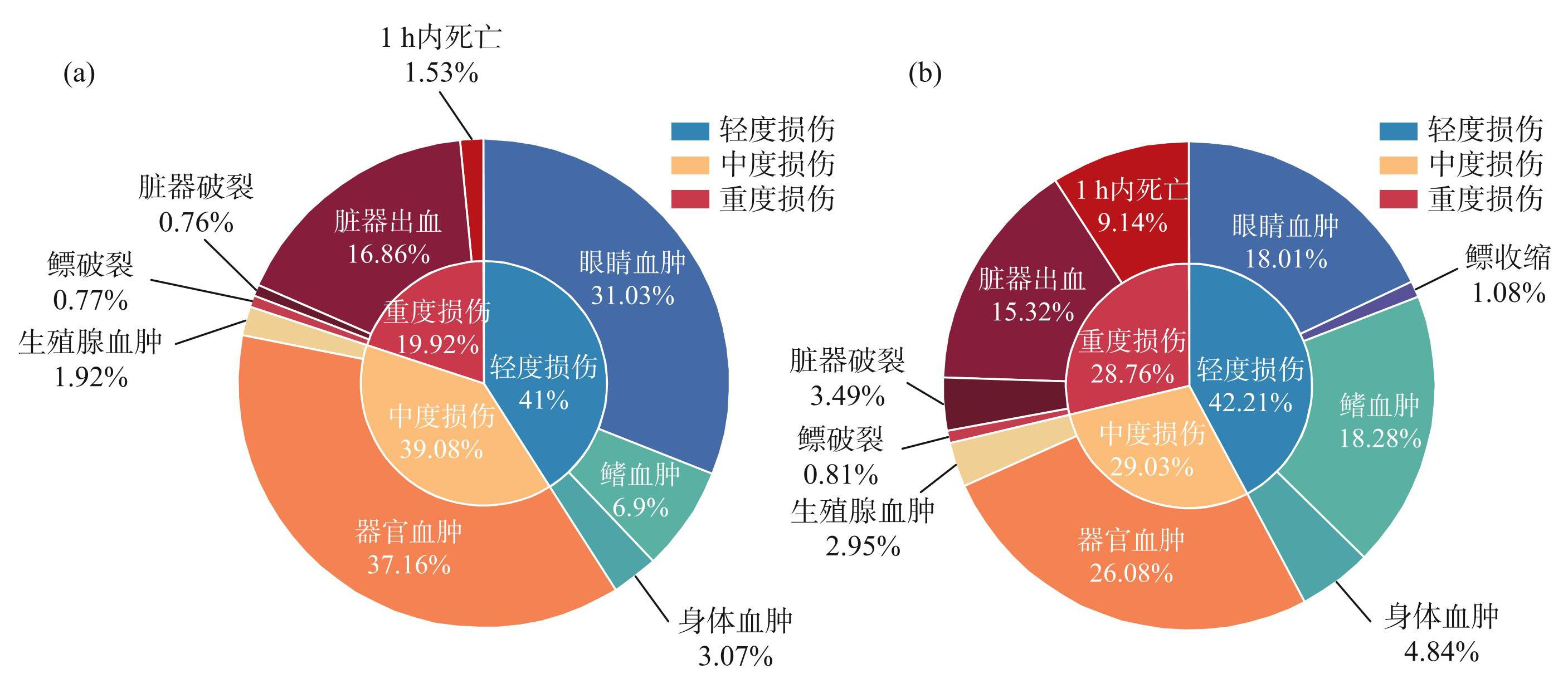 草鱼幼鱼的生理损伤程度如图9所示,同暴露时长下随着声压级的增大,重度损伤占比上升,轻度损伤占比下降。在声压级为140 dB、暴露时长为30 min的条件下,重度损伤占比达到最大,为34.00%。比较不同暴露时长下损伤类别的差异,发现当暴露时长为15 min 时,轻度损伤占比最大,为41.00%。其中,眼睛血肿是最常见的轻度损伤,占轻度损伤的75.68%;其次是中度损伤,该类别中最常见的损伤为器官血肿,占中度损伤的95.04%;占比最小的是重度损伤,该类别中最常见的损伤为脏器出血,占重度损伤的84.64%。与暴露时长15 min相比,暴露时长30 min下的鳍血肿比例(18.28%)大幅度上升,成为占比最高的轻度损伤,且草鱼幼鱼开始出现鳔收缩。1 h 内死亡和脏器破裂分别占重度损伤的31.78%和12.13%,相较于暴露时长15 min下的重度损伤占比分别上升了24.10%和8.26%,而脏器出血则下降了31.37%。总的来说,随着暴露时长的增加,重度损伤占比上升,中度损伤占比下降,轻度损伤上升幅度较小。