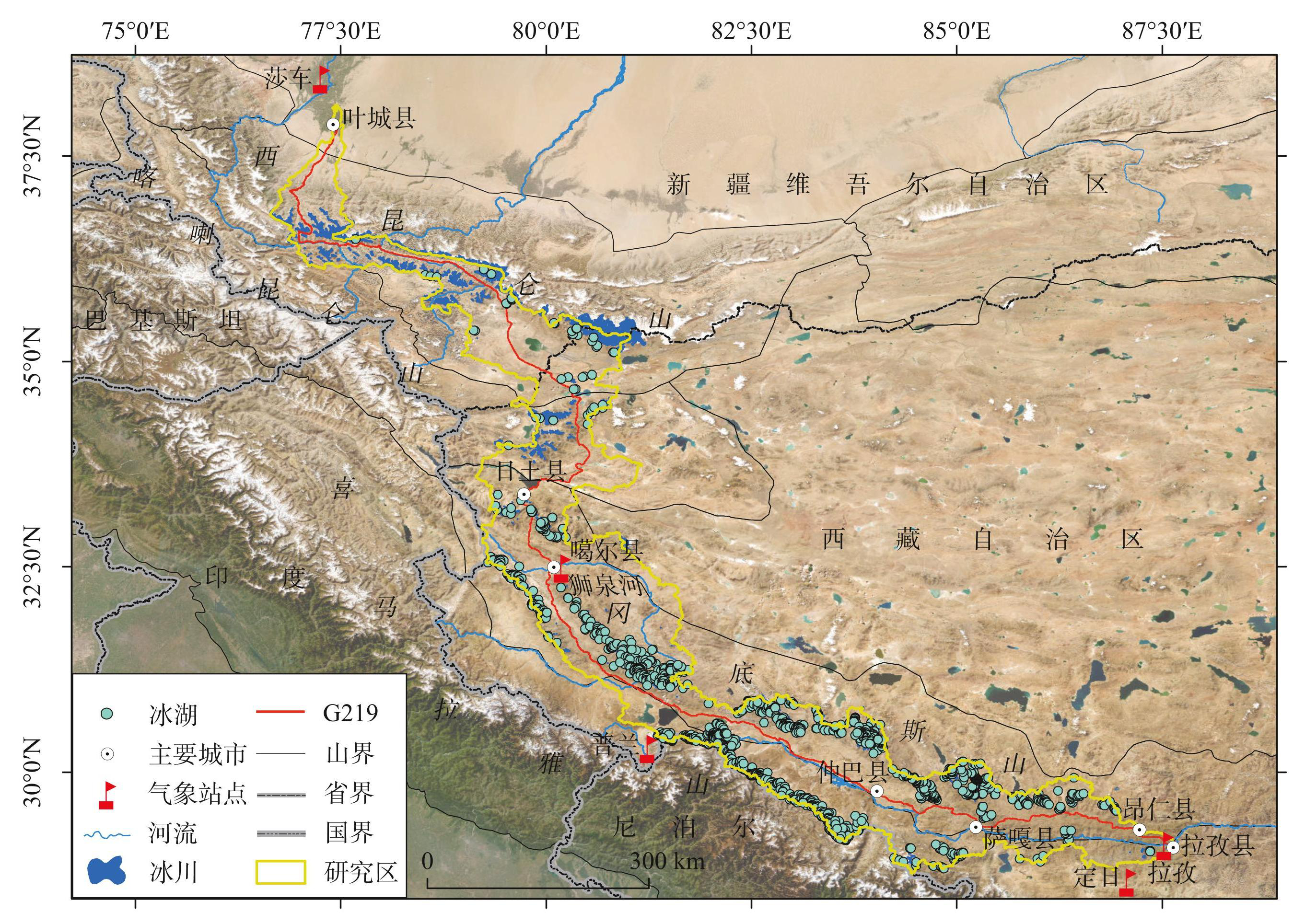 位于青藏高原西部的新藏公路(G219)是连接新疆和西藏的重要交通线,沿线途经喜马拉雅山、冈底斯山、喀喇昆仑山和西昆仑山等众多山脉,这些区域冰湖广泛发育,公路易受潜在冰湖溃决洪水(glacial lake outburst floods, GLOFs)威胁。本文基于Landsat ETM+和Sentinel-2 MSI遥感影像,采用归一化差异水体指数(normalized difference water index, NDWI)方法与人工目视解译法相结合的方式提取2000年和2022年新藏公路沿线流域冰湖边界数据,并对该区域冰湖时空演变特征、GLOF危险性及潜在受影响路段进行了分析和评估。结果表明:(1)2022年新藏公路沿线流域共有冰湖1412个,总面积达141.13 km2;2000—2022年期间,研究区内面积≥0.01 km2的冰湖数量和面积均呈增长趋势,分别增加了98个(7.46%)和2.16 km2(1.56%);海拔4500 m以下的冰湖数量和面积相对稳定,而海拔5000 m以上地区的冰湖数量和面积增加相对迅速。(2)对研究区内面积>0.1 km2的70个冰碛湖进行GLOF危险性评估发现,具有极高、高、中和低危险性的冰碛湖分别有13、24、13和20个;新藏公路共有10处路段易受冰湖溃决洪水威胁,特别是R1(K514+210~K514+770)、R2(K793+190~K802+250)、R4(K1286+690~K1287+880)、R8(K1684+900~K1685+380)和R9(K1786+110~K1801+700),这些路段应加强上游冰湖动态监测并采取相应的防治措施。