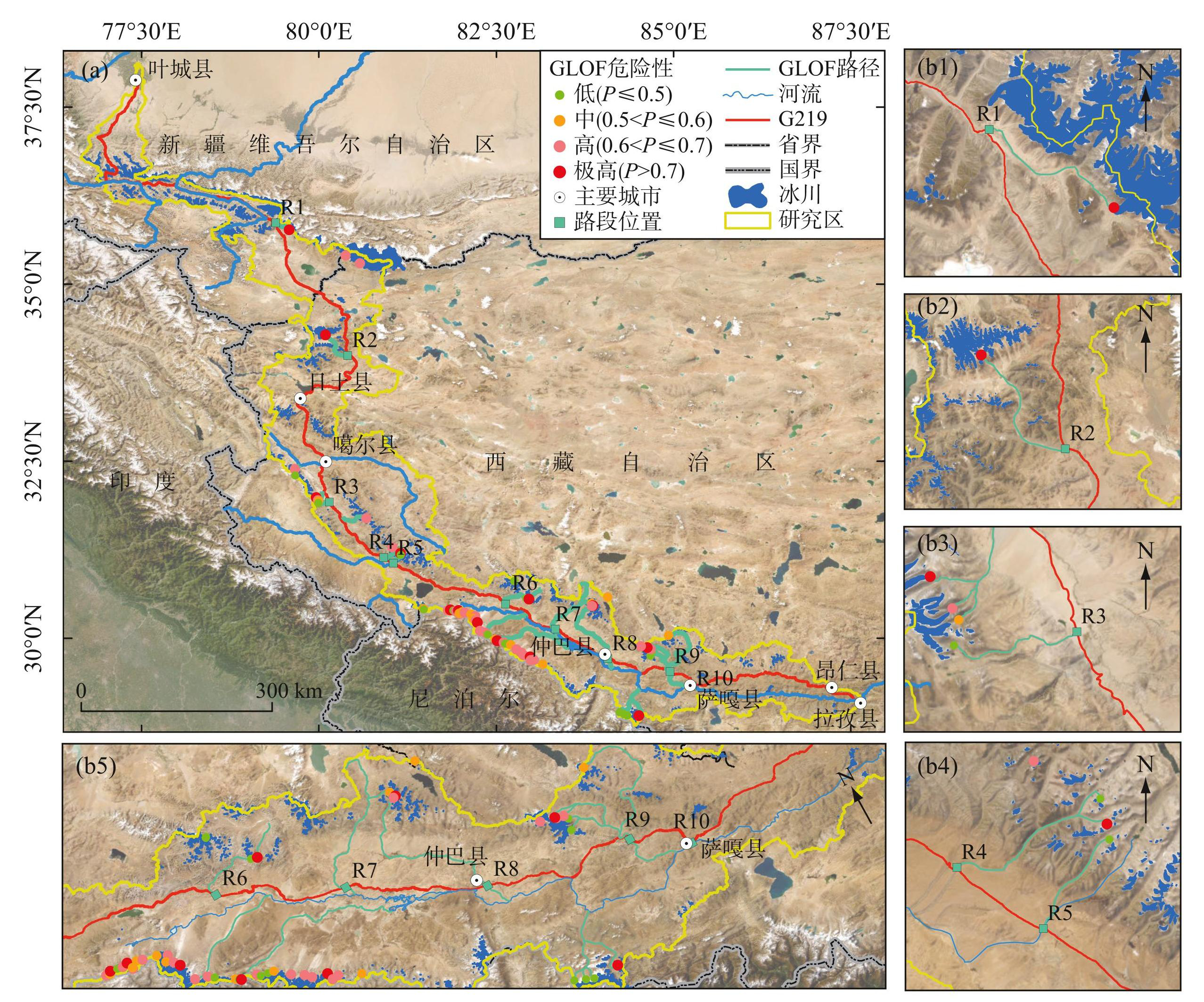 图6新藏公路沿线流域危险冰湖(a)及易受影响路段位置(b1~b5) (基于自然资源部标准地图服务网站下载的审图号为GS(2019)1822号的标准地图制作,底图无修改)